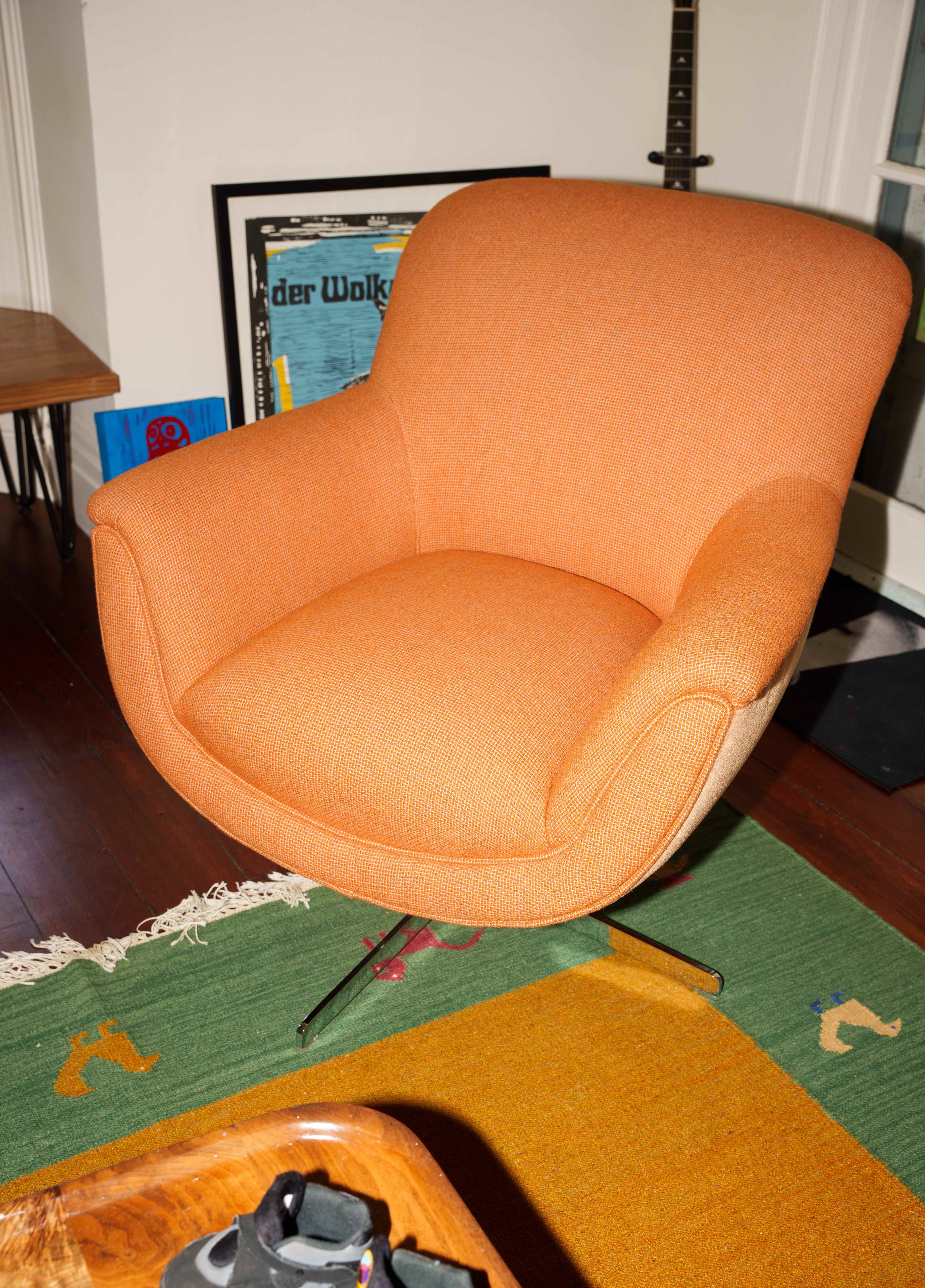 There was an empty hole in the space, and I knew I needed a chair, but I needed the perfect chair. I chose a different color that wasn’t available. But they had the orange one, and I thought that could actually work. So I conceded and said yes to the orange. Typically orange is not my go to color but you’ll see from the photos it fits in the space so perfectly and the space is pretty curated. It was the best instinct, it literally fits like a glove in the space. It brought it to life.